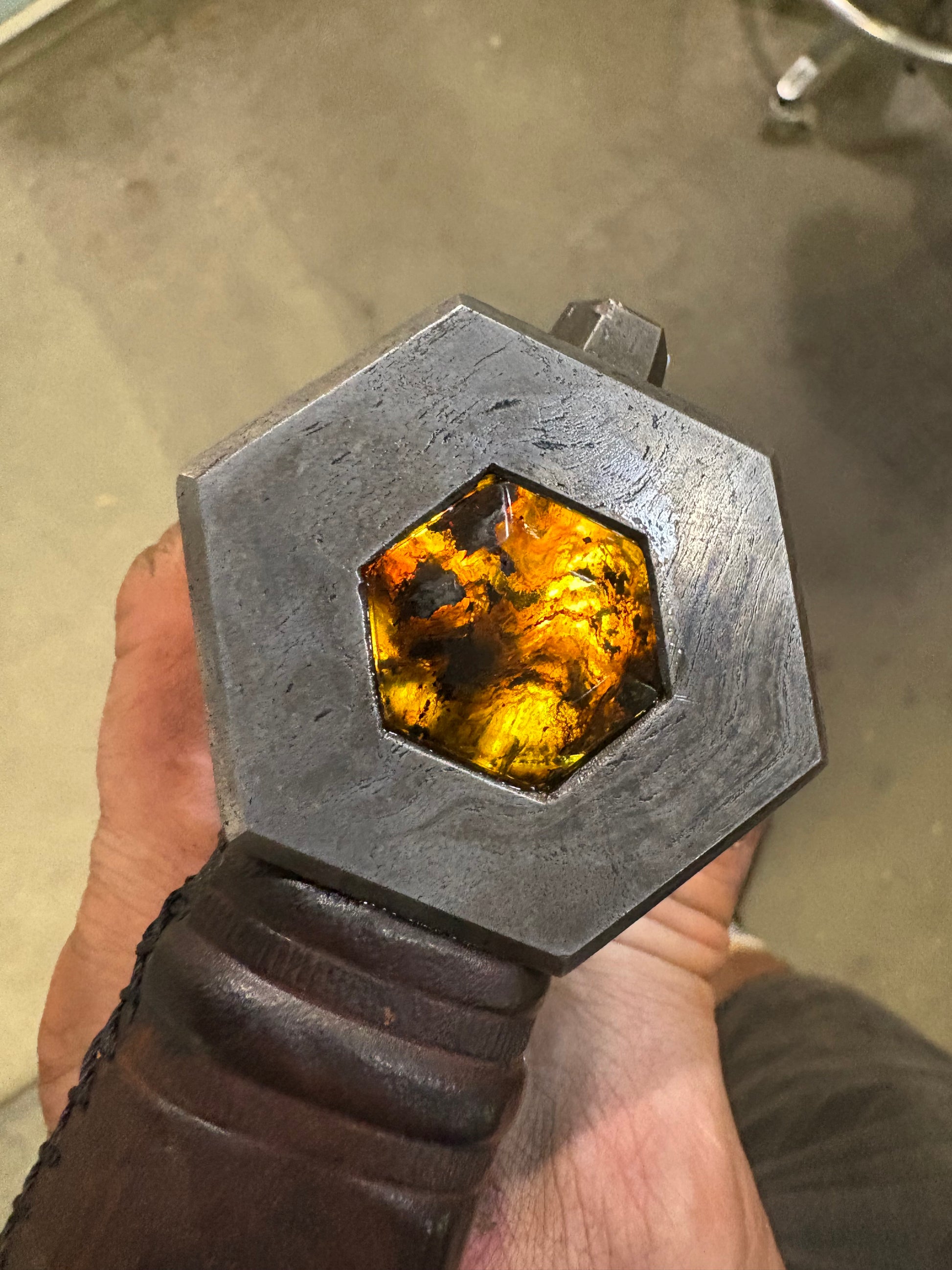 Type XIV inspired arming sword with hex pommel. Wrought iron guard and pommel. Fossilized Chiapas amber in pommel. Poplar wood handle wrapped in leather. Blade is 8670 spring steel with tapering fuller, blade etched for weathered patina.